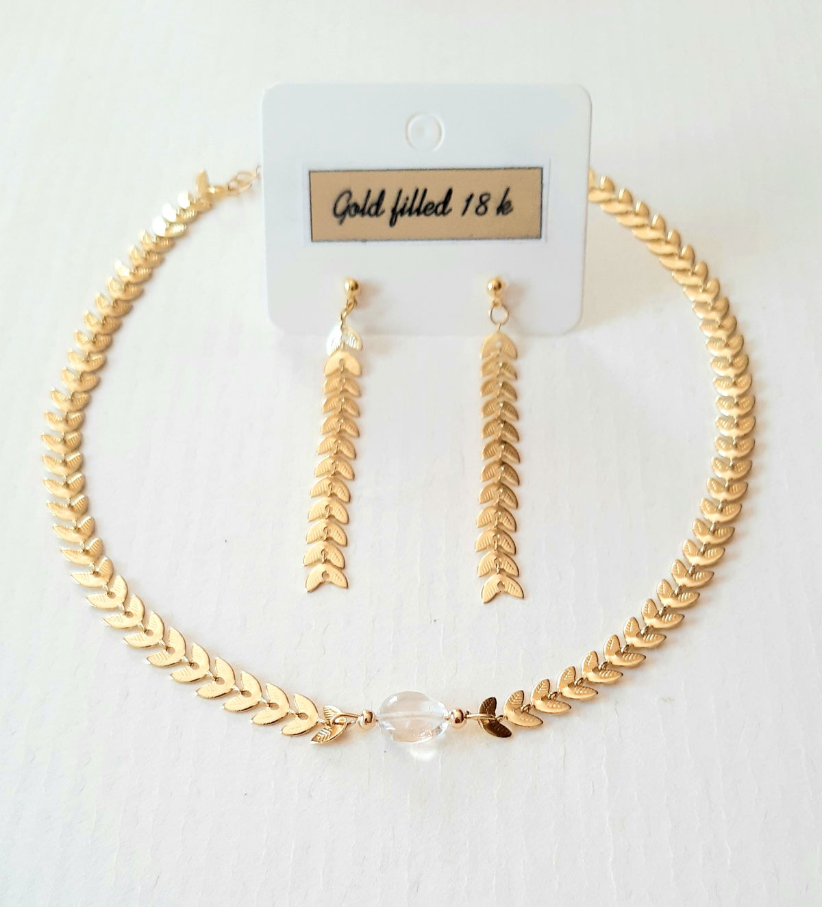 Gargantilla elaborada con espigas bañadas en oro 18k y semilla de cuarzo transparente. Largo 32cm sin el extensor.