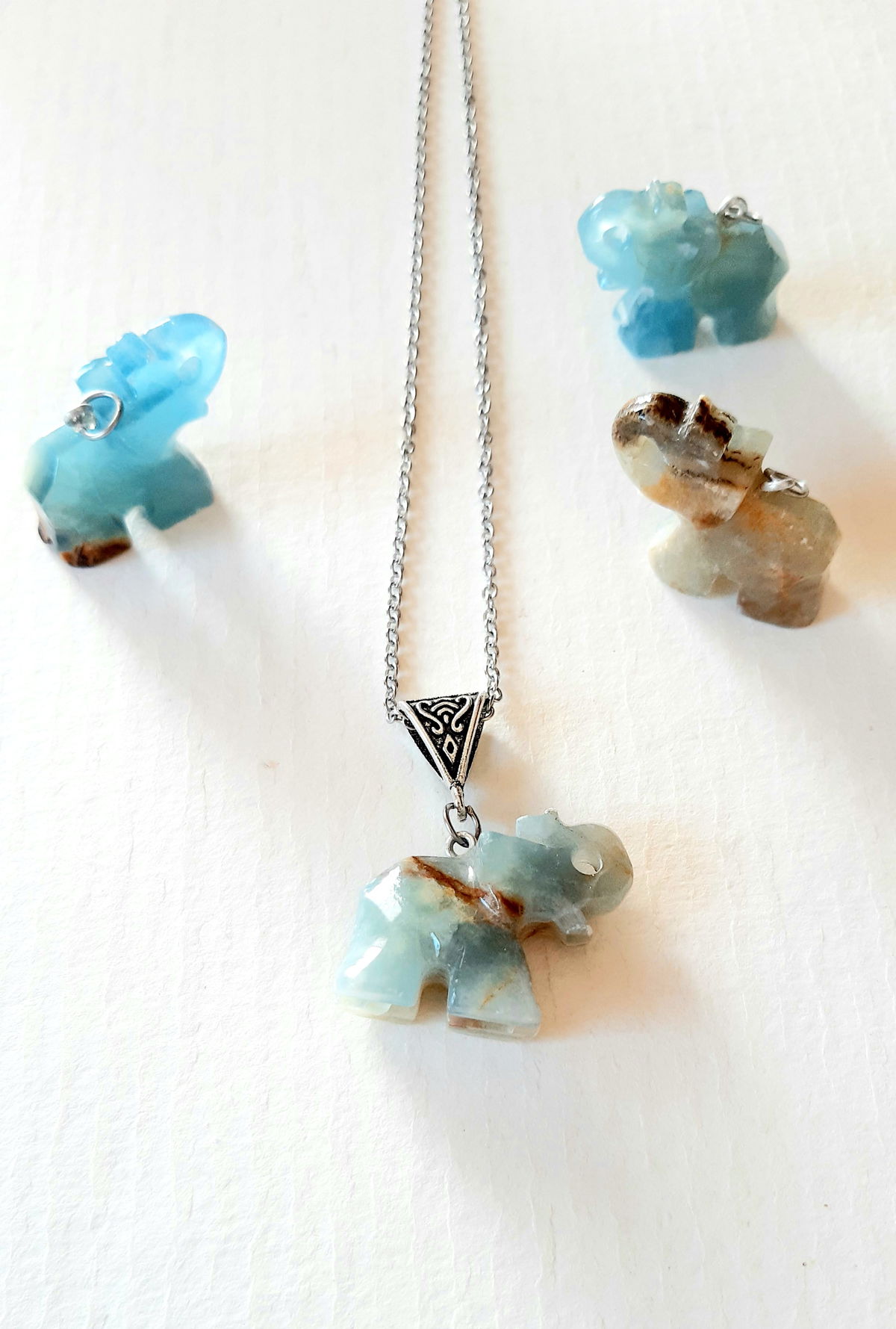 Collar elaborado con elefante de ónix azul o Celeste cadena de acero portadije de zamac.
