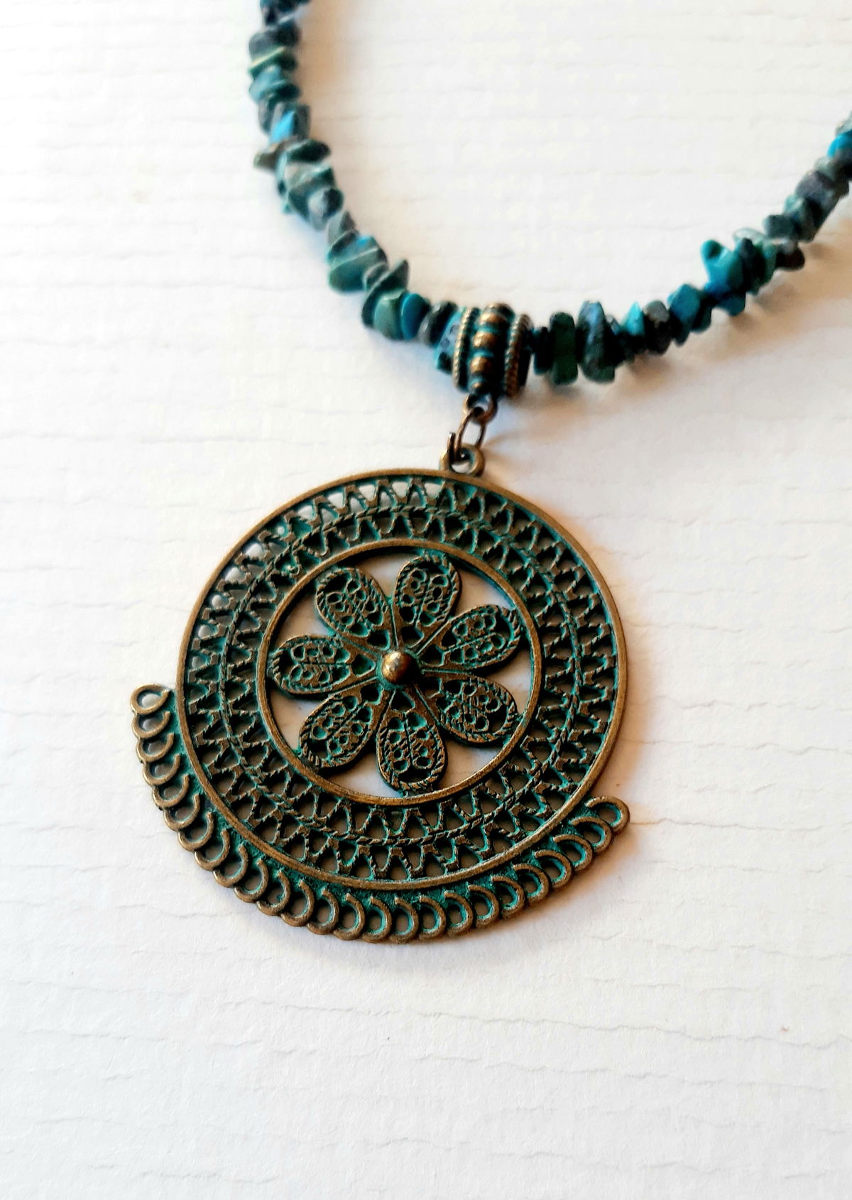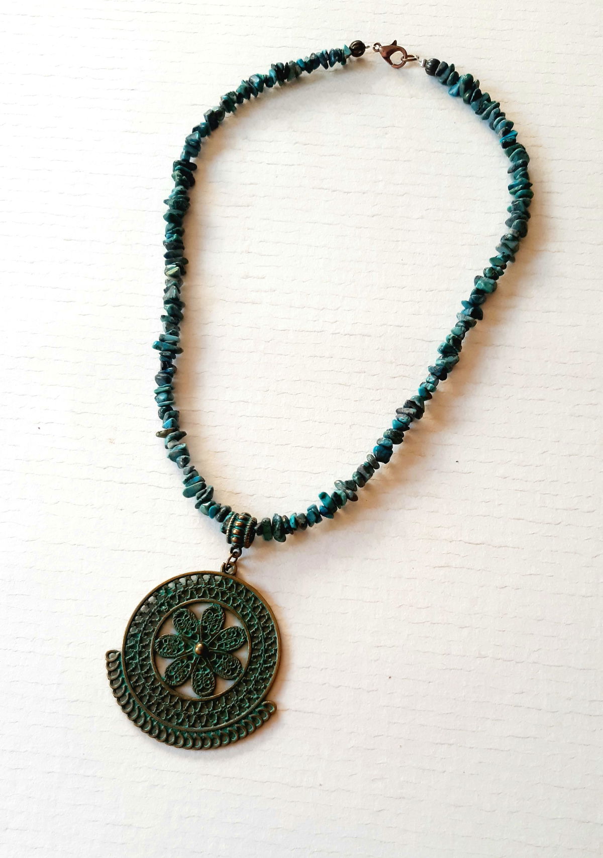 Collar elaborado con escallas de piedra de turquesa africana y apliques metálicos. 40 cm de largo.