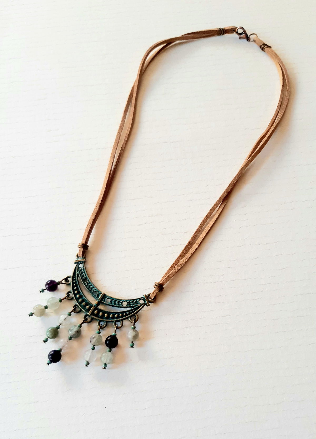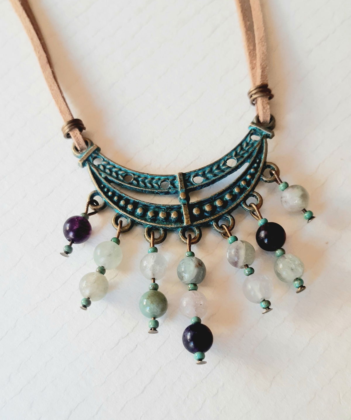 Collar elaborado con piedras naturales de fluorita apliques metálicos y cordón de gamuza. Largo total de 45 cm.
