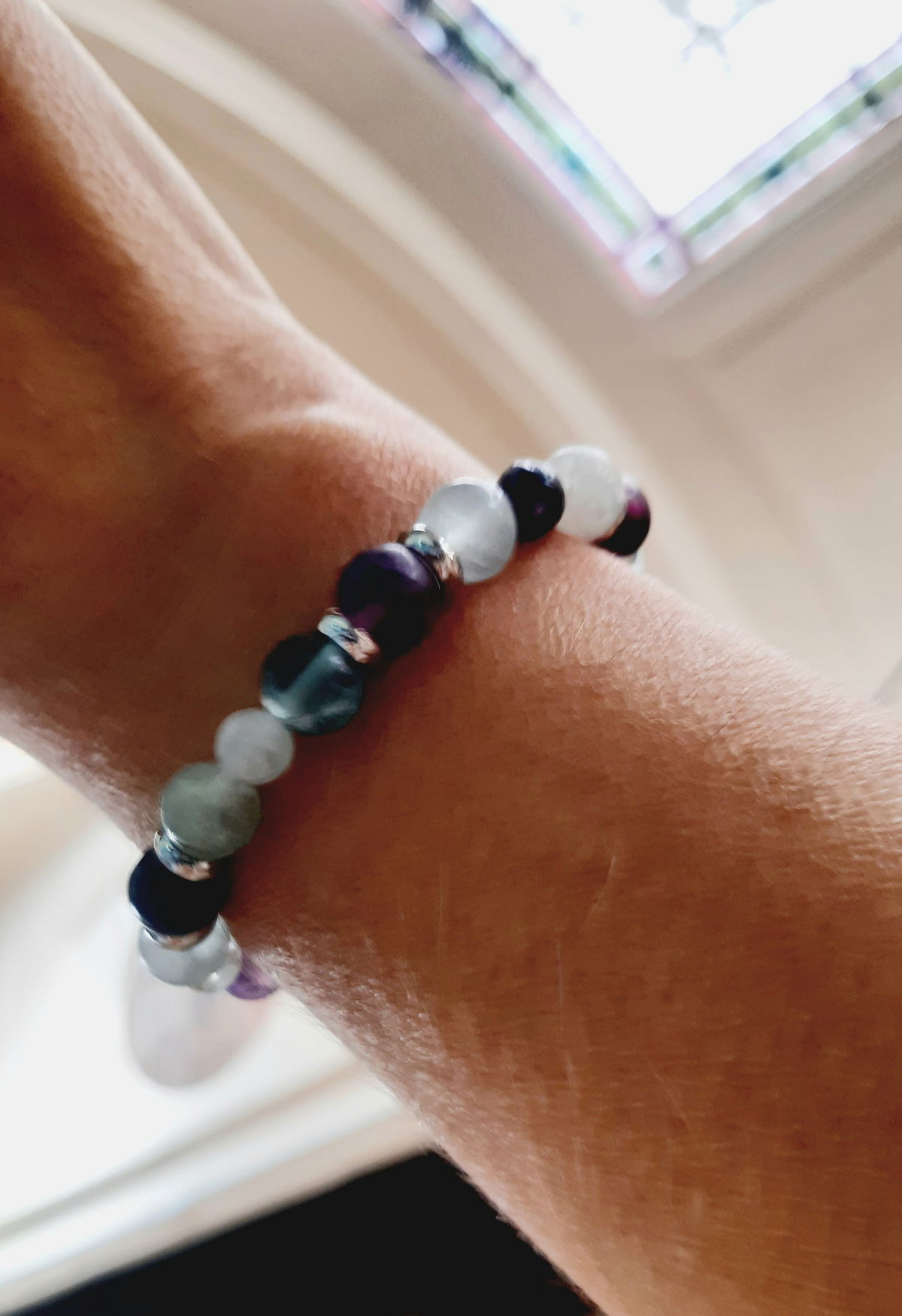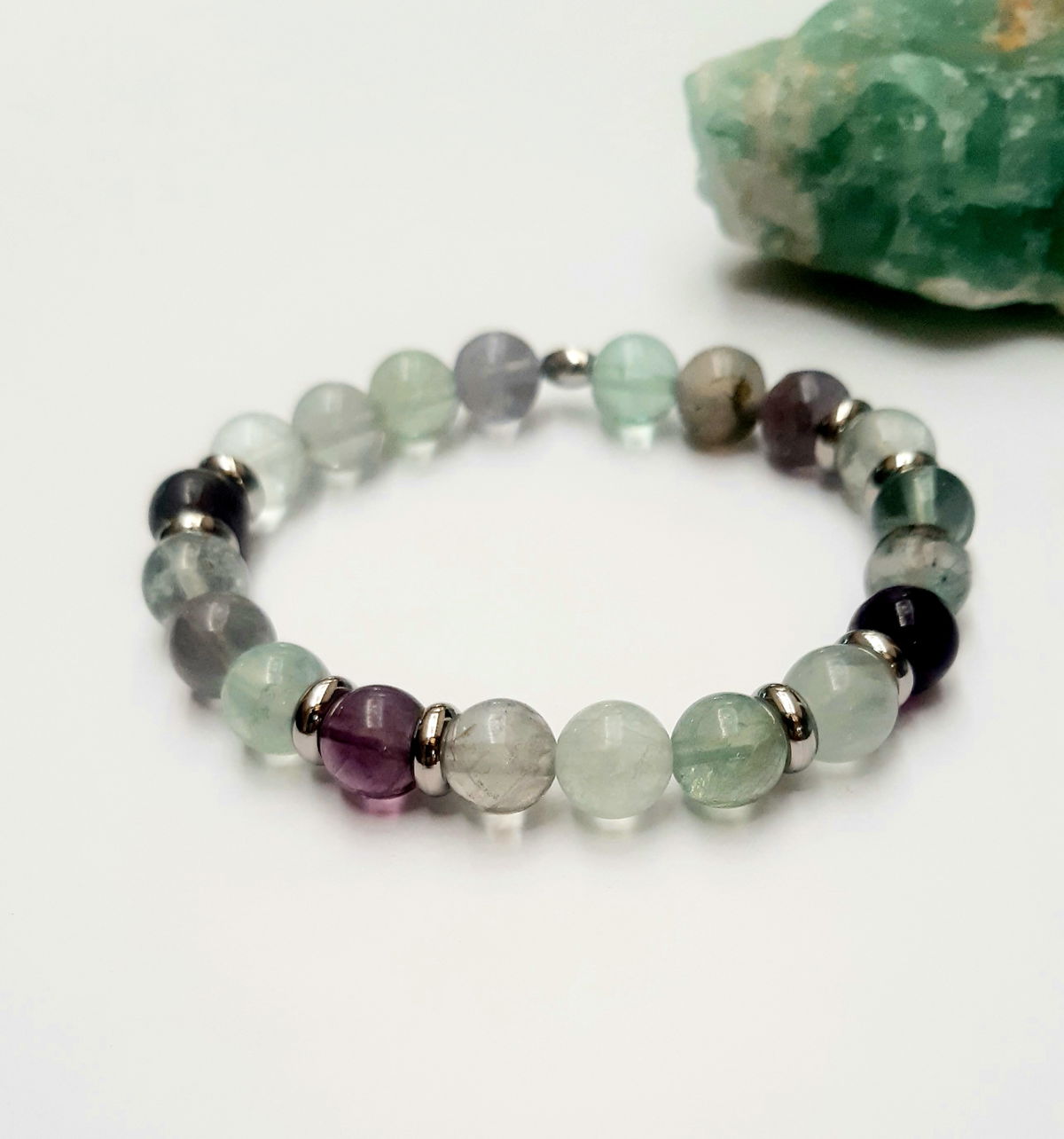 Pulsera elástica elaborado con piedras naturales de fluorita esféricas de 8 mm y separadores de acero quirúrgico.