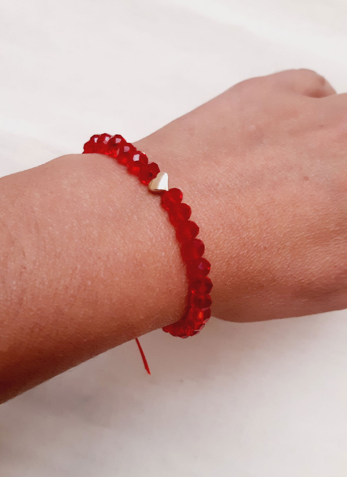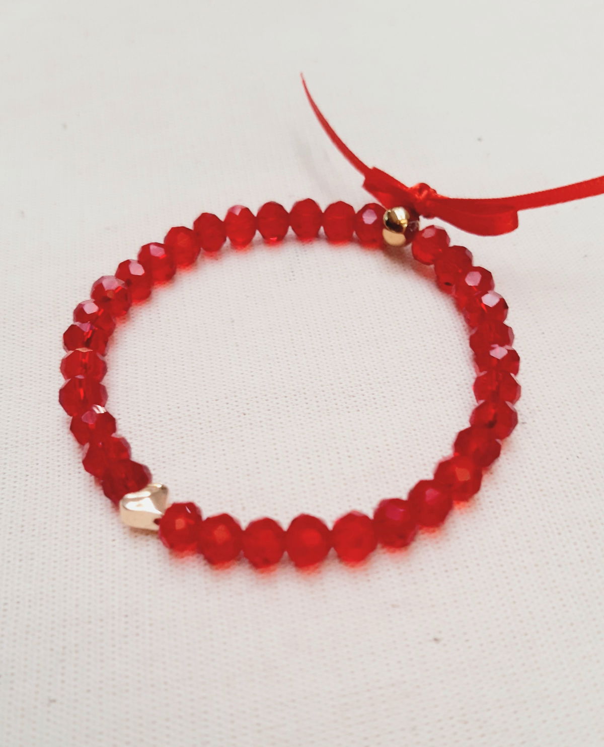 Pulsera elástica elaborada con cristales de vidrio facetados rojos, corazón y balín tapanudos de goldfilled laminados en oro de 18 kilates y cinta roja.