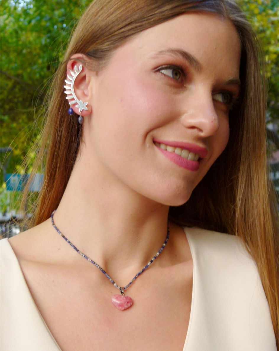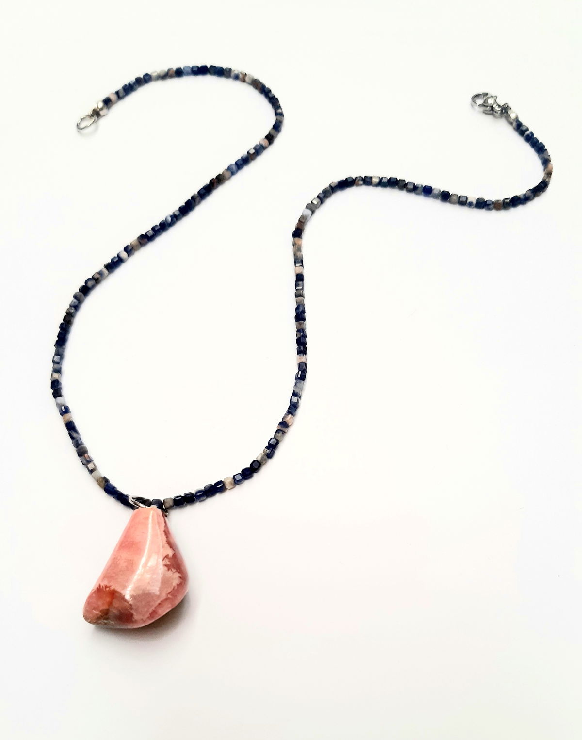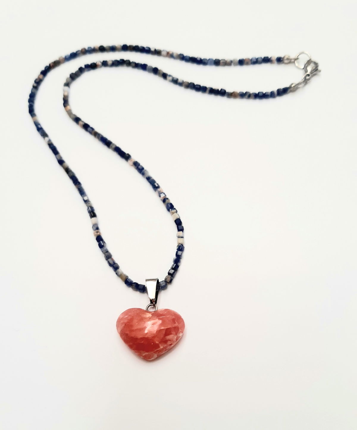 Collar elaborado con piedras de Sodalita de 2 mm y dije corazón en rodocrosita, o forma irregular.