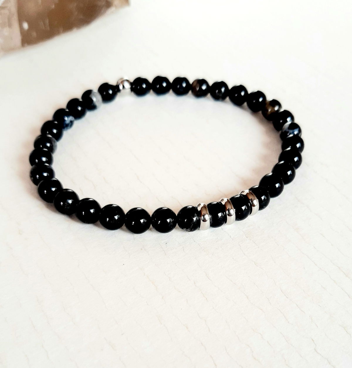 Pulsera elástica elaborada con esferas de turmalina negra con vestigios de cuarzo blanco natural de 6mm y apliques de acero.