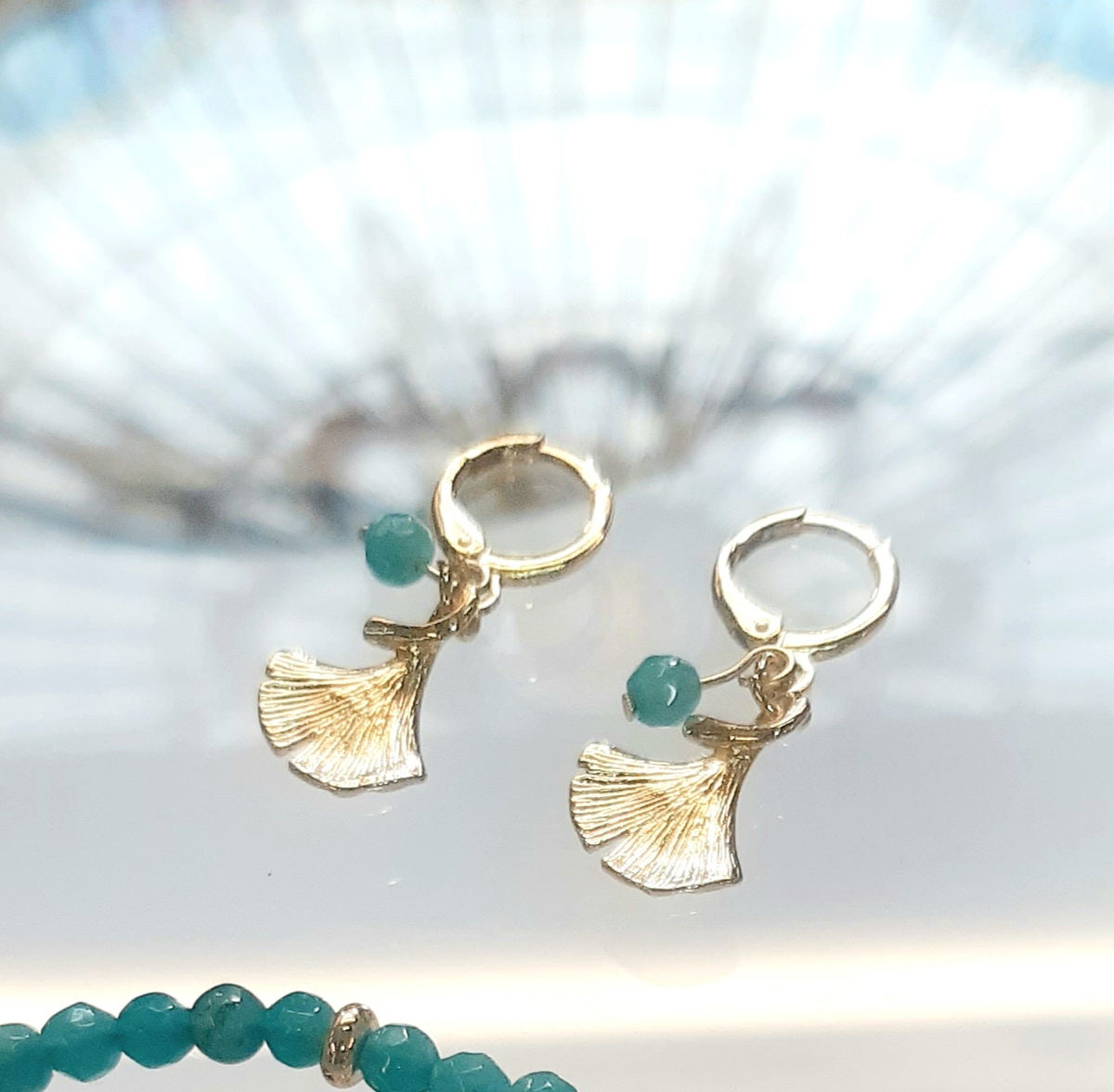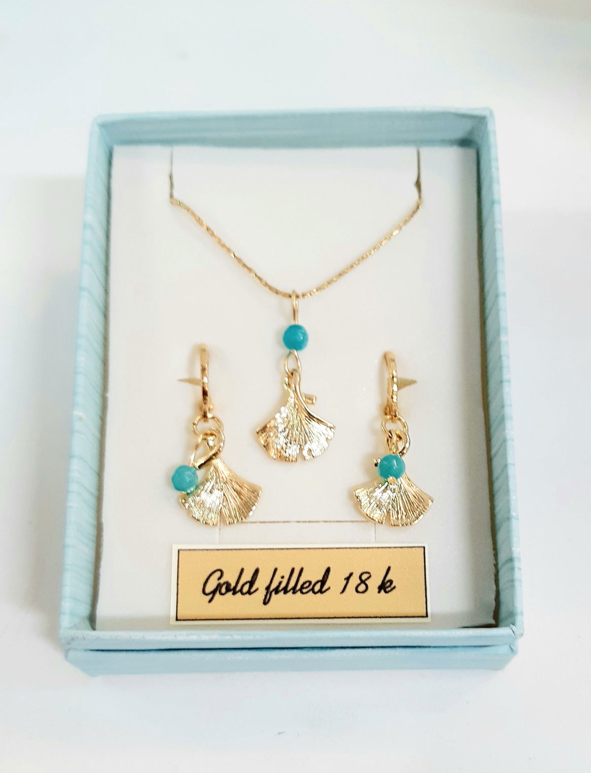 Conjunto de collar y aros con piedra natural de ágata, apliques de hoja de ginco con baño de oro 18 k y cadena en acero dorado. Los Aros tienen cierre seguro con baño de oro 18 k.