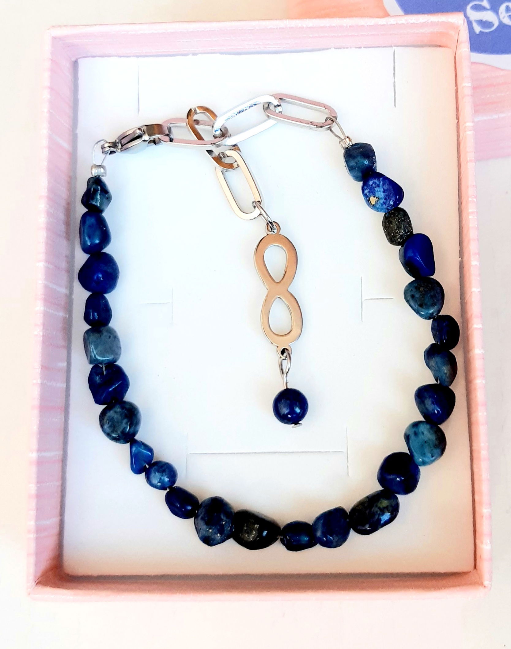 Pulsera ajustable elaborada con piedras naturales de Lapislázuli en forma de semillas. Apliques y cadena de acero inoxidable.