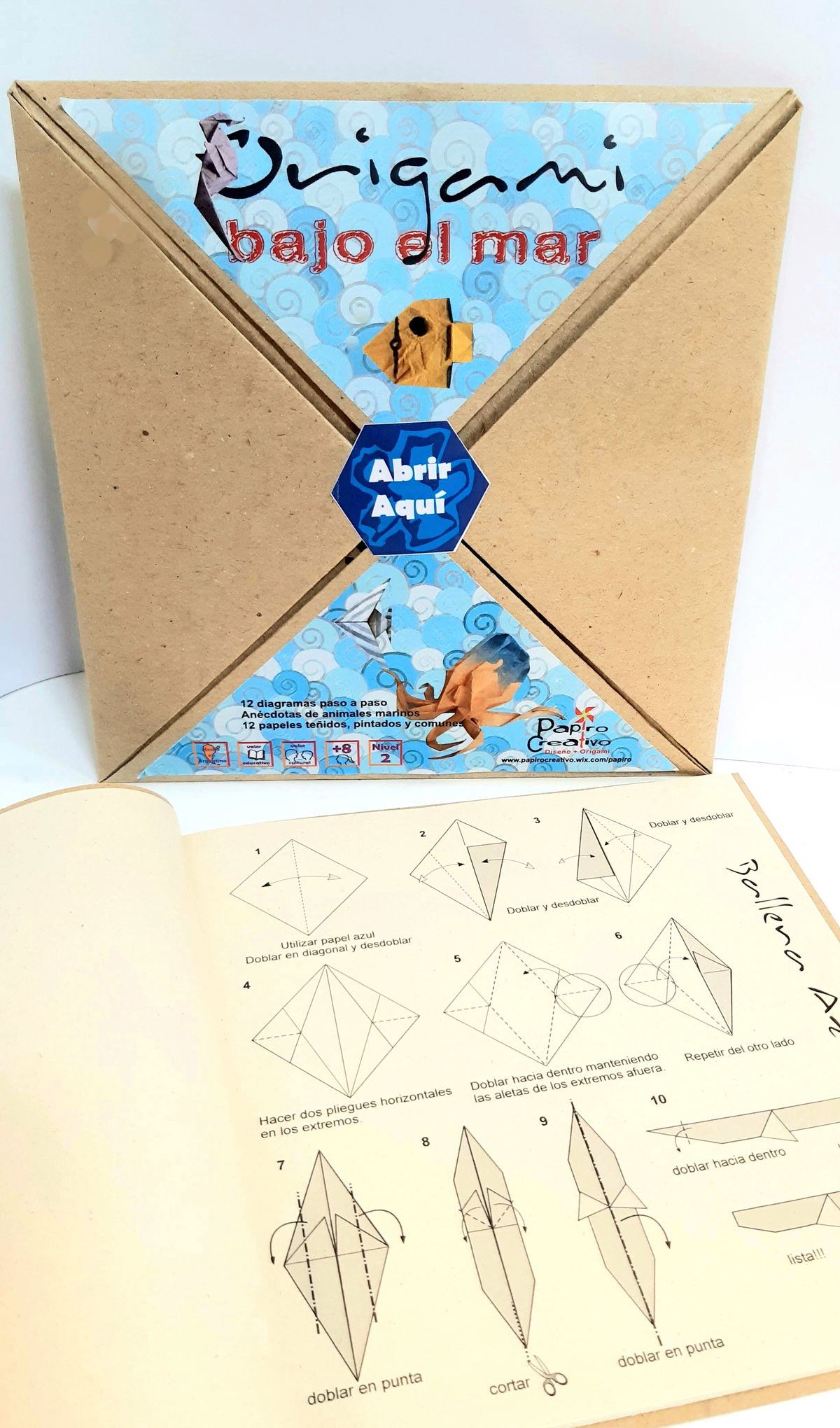 Kit diseñado para niños a partir de los 12 años, incluye libro con 12 diagramas paso a paso, información y anécdotas de los animales marinos y 12 papeles especiales, algunos pintados a mano para realizar cada diagrama.