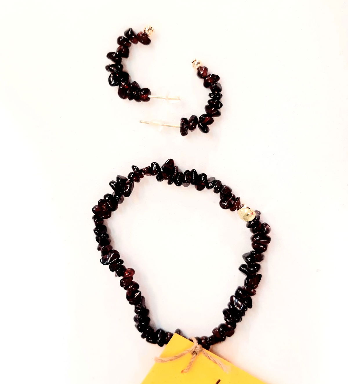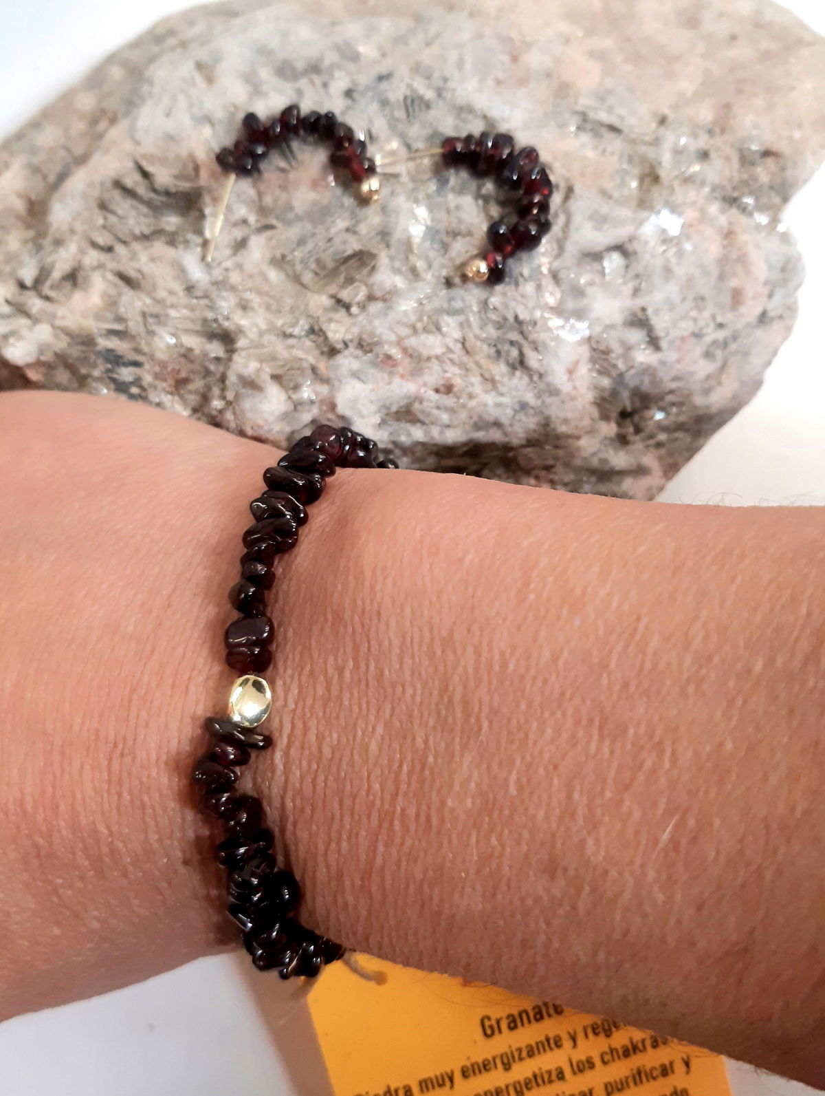 Pulsera elástica elaborada con piedras naturales de granate y separador con baño de oro 18 k.