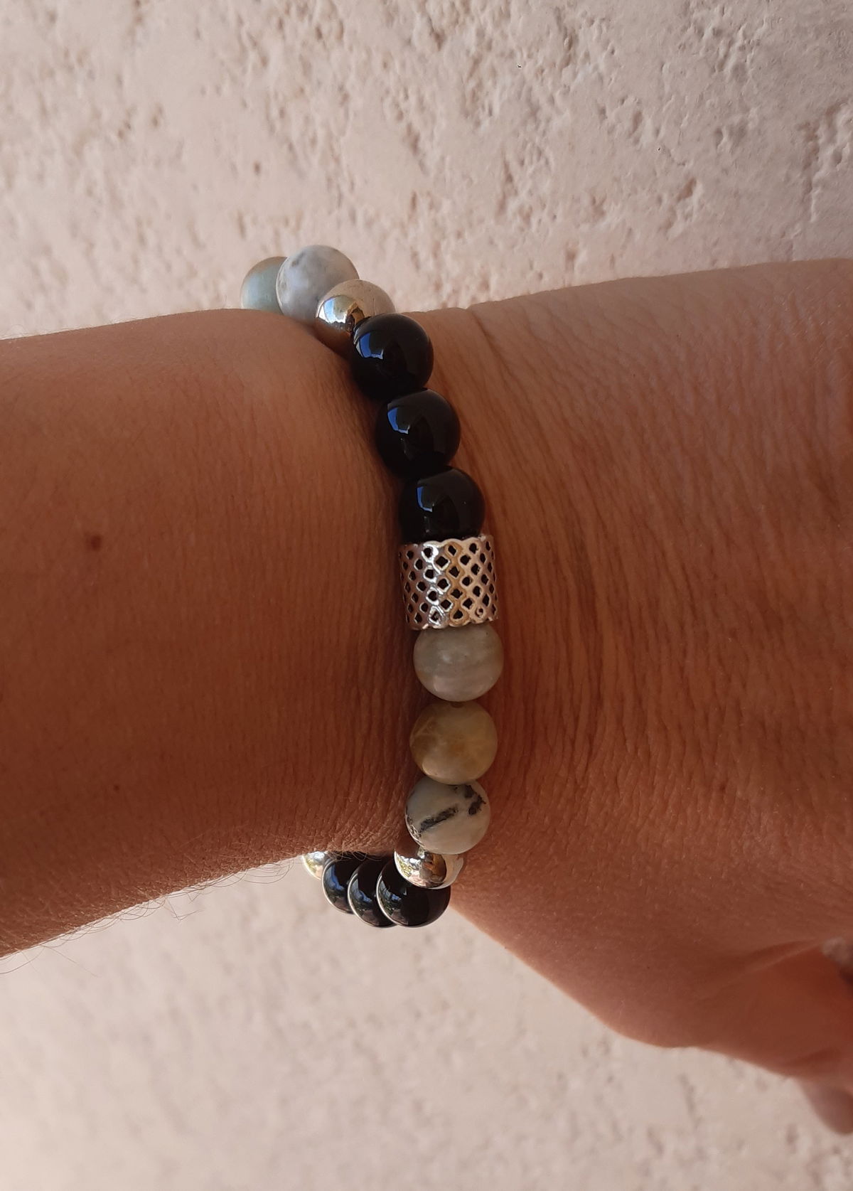 Pulsera elástica elaborada con esferas de Amazonita y Obsidiana natural, y apliques de acero.