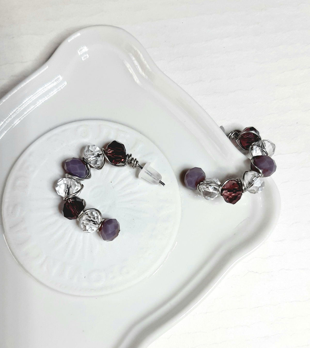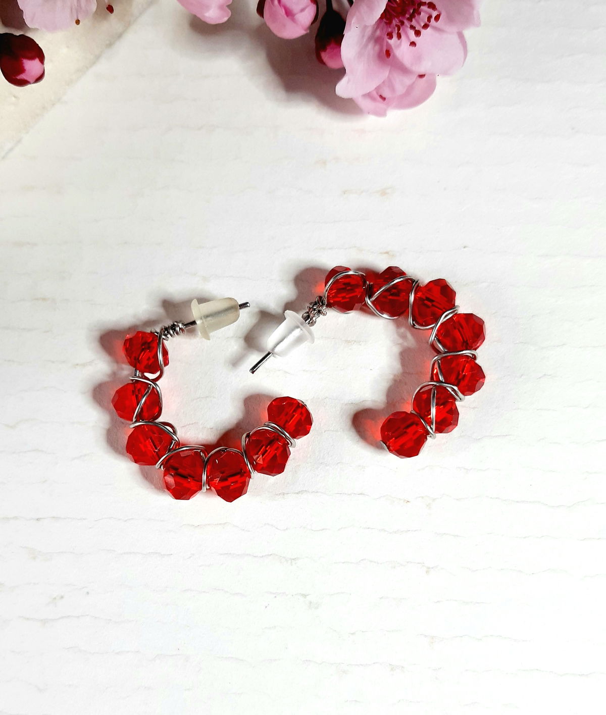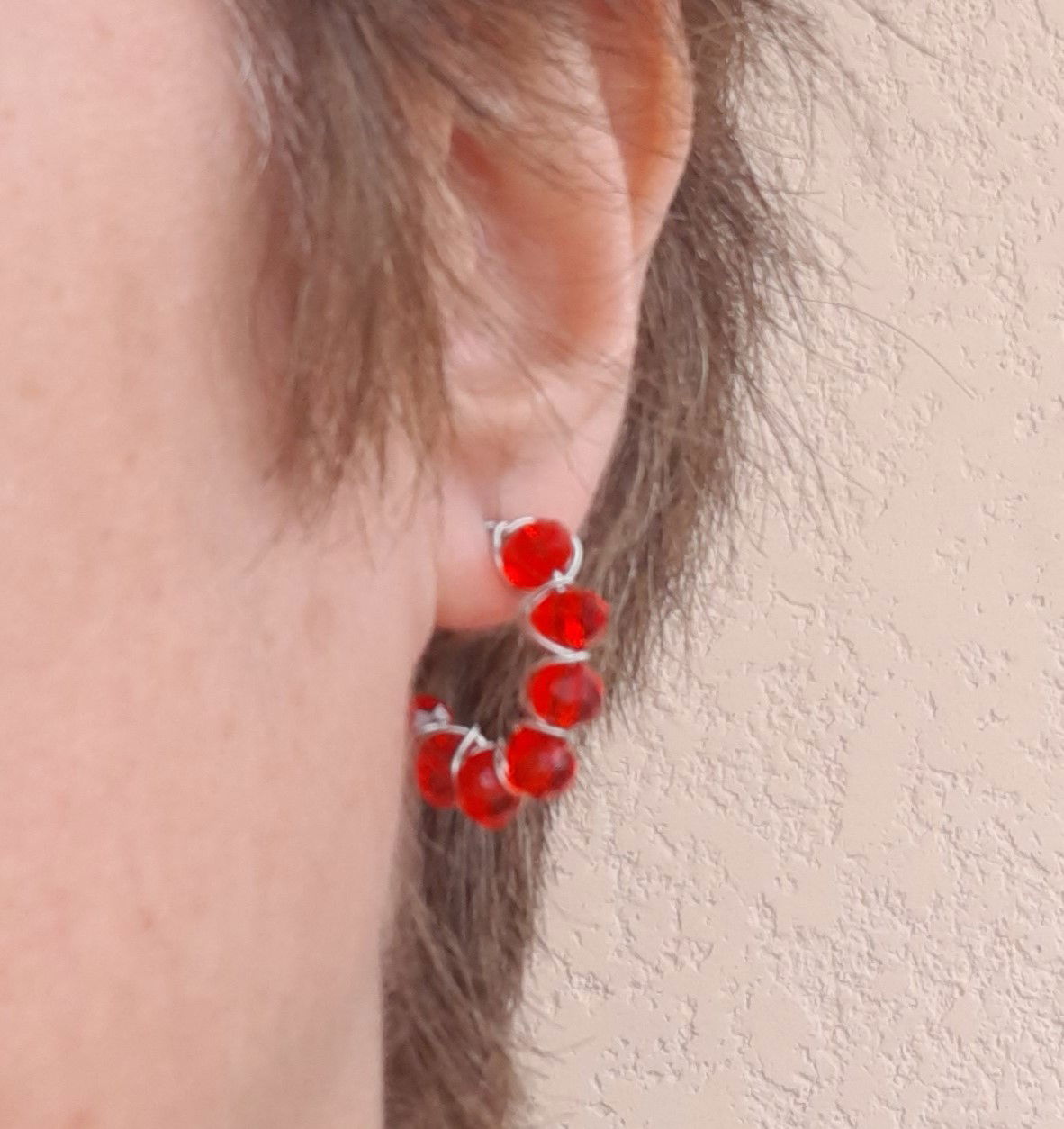 Aros elaborados con cristales facetados y alambre de acero. Colores: Rojo, combinados violeta y transparente, y champaña.