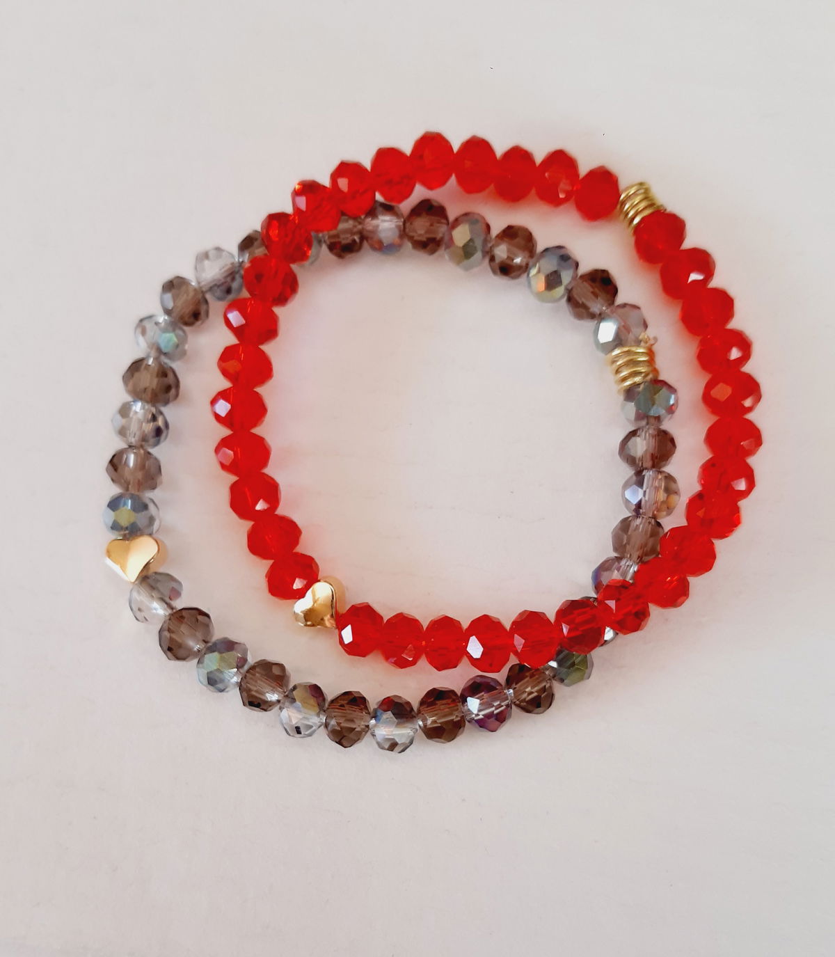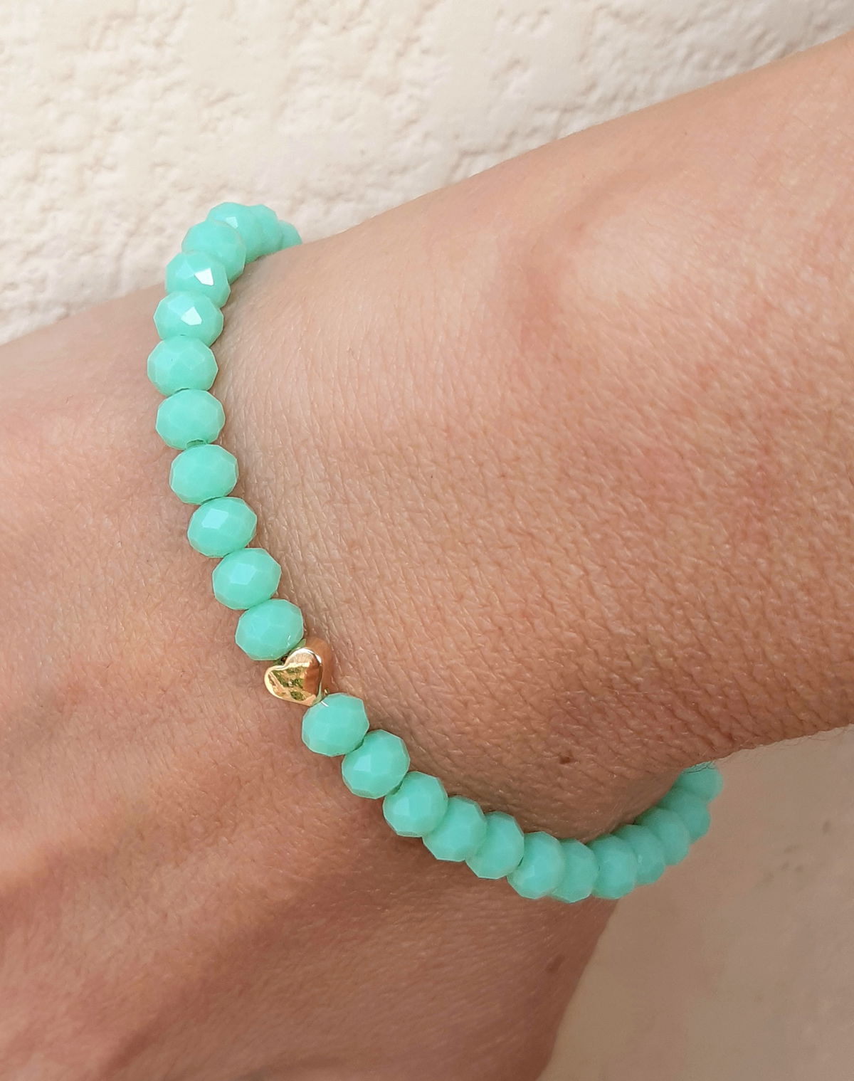 Pulsera elástica elaborada con cristales de vidrio facetados y corazón goldfilled laminado en oro de 18 kilates.
