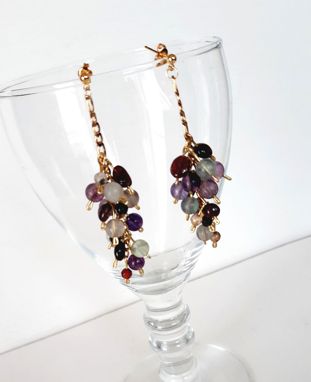 Aros elaborados con piedras naturales de Fluorita, Turmalina y Granate. Cadena base en acero dorado y aro perlita pasante laminado en oro 18 kilates.