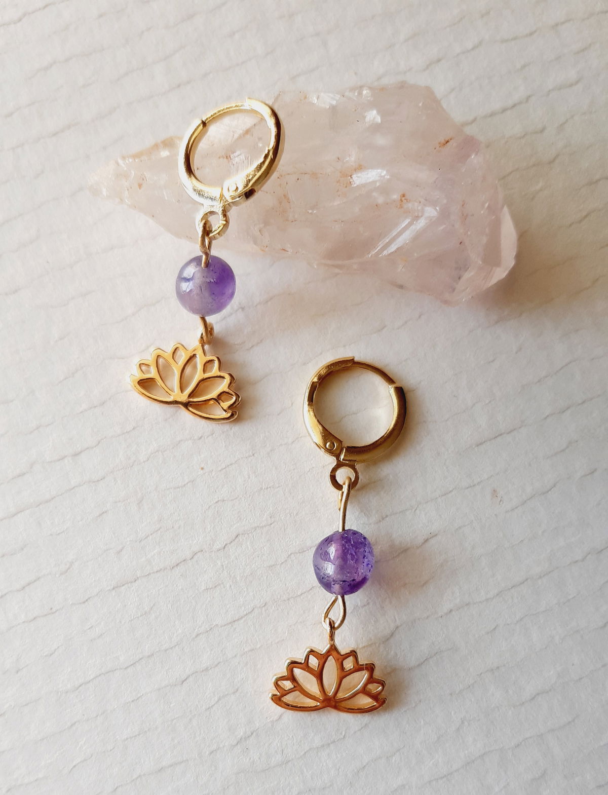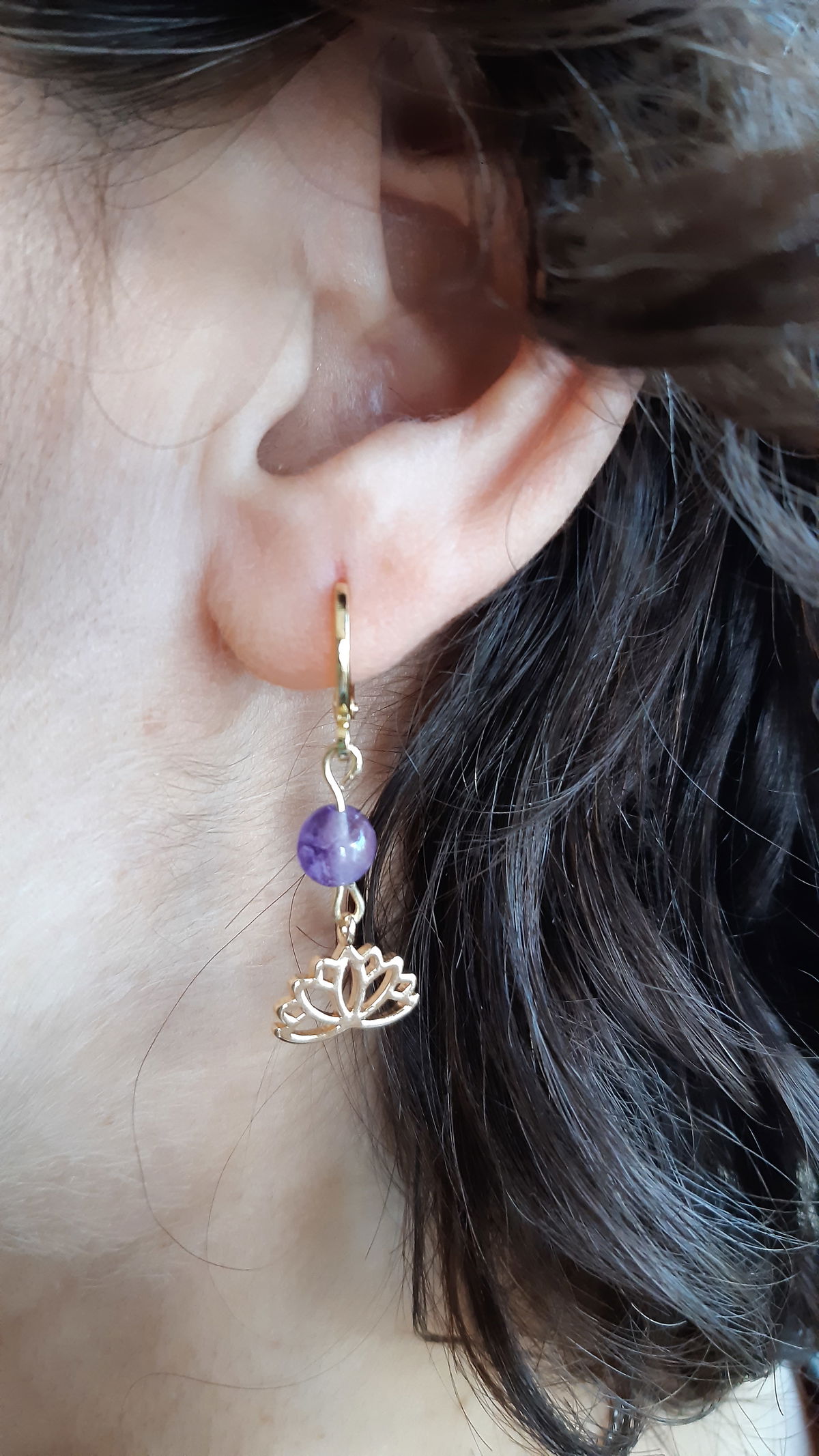 Aros elaborados con argolla y dije flor de loto bañados en oreo 18 k y piedra de Amatista.