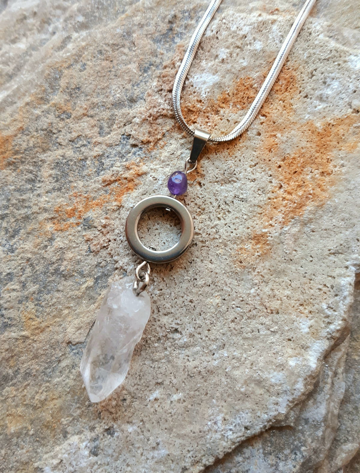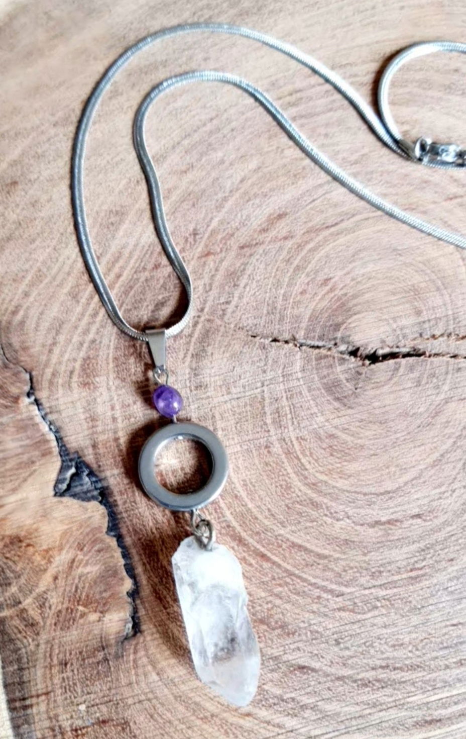 Collar elaborado con péndulo rústico de cuarzo cristal y gota de amatista apliques y cadena en acero.