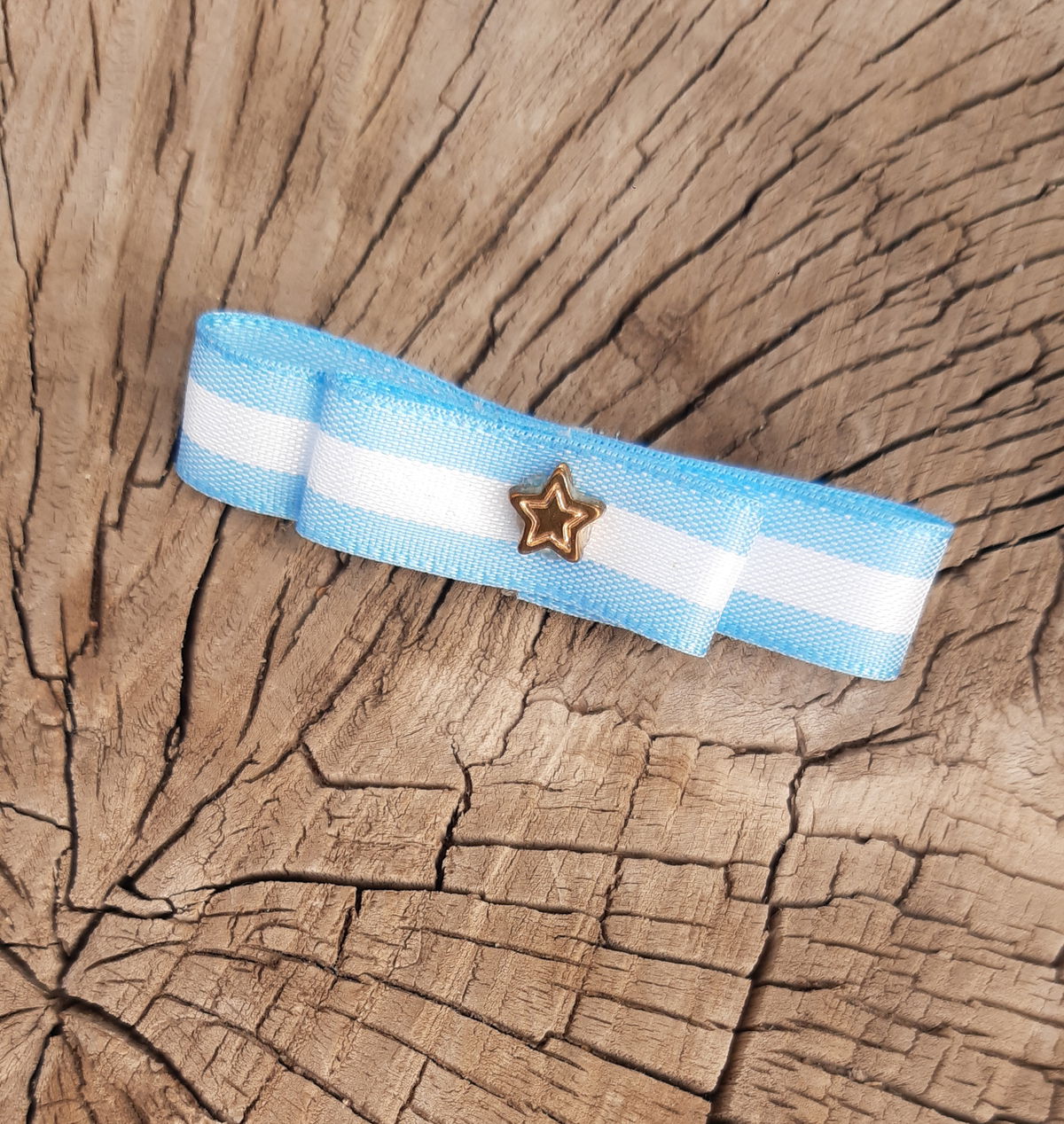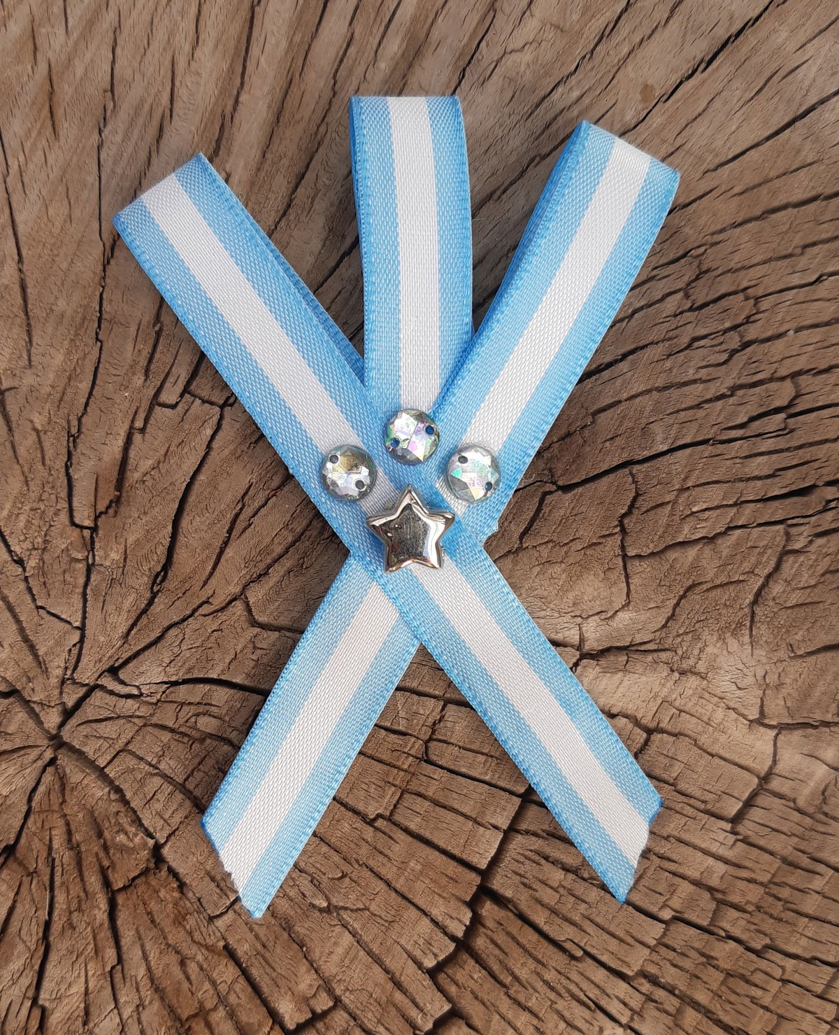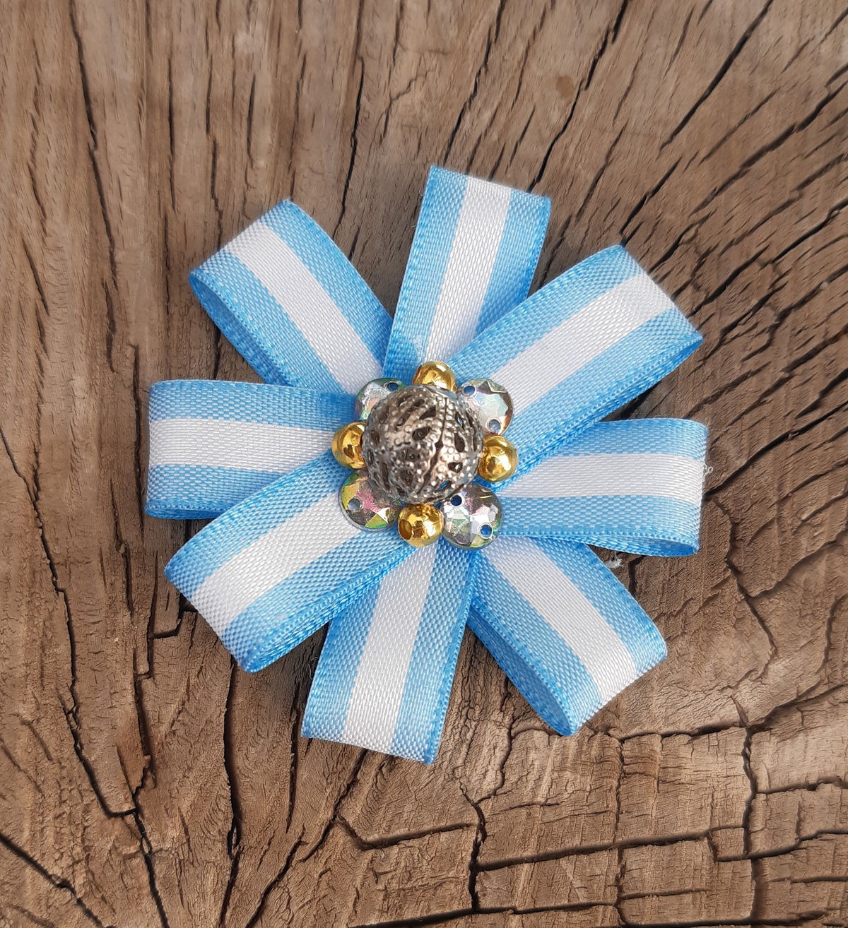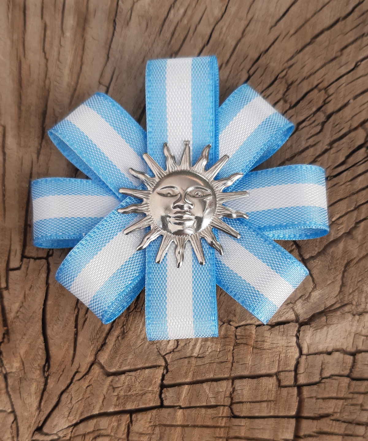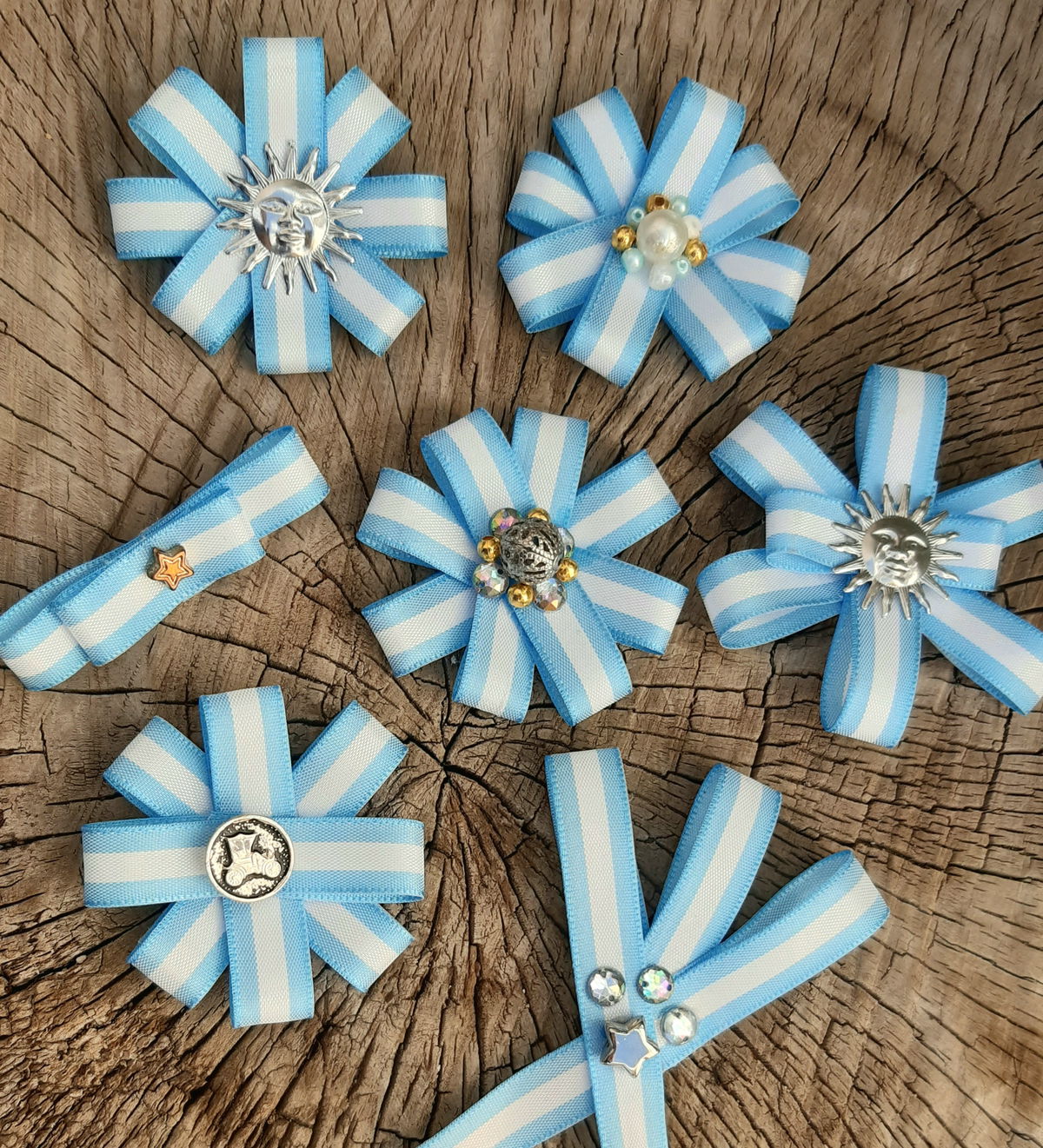 Escarapelas elaboradas con cinta de tela y apliques diversos metálicos y modelo sol de acero, todas tienen gancho de seguridad.