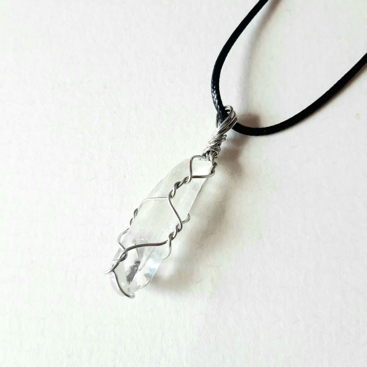 Collar elaborado con punta de cuarzo cristal engarzada con alambre de cobre y cadena de acero. Hay distintos modelos con o sin apliques de acero. La cadena puede variar según stock.