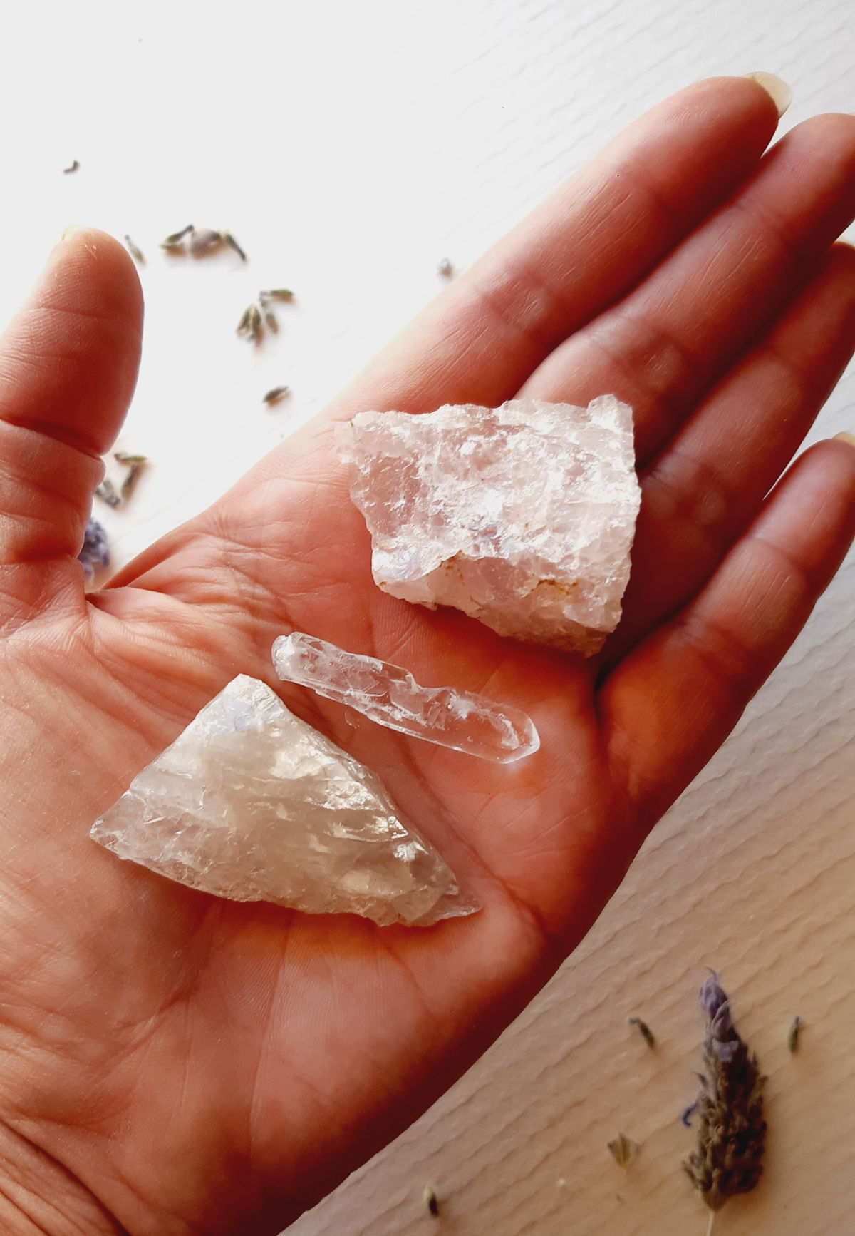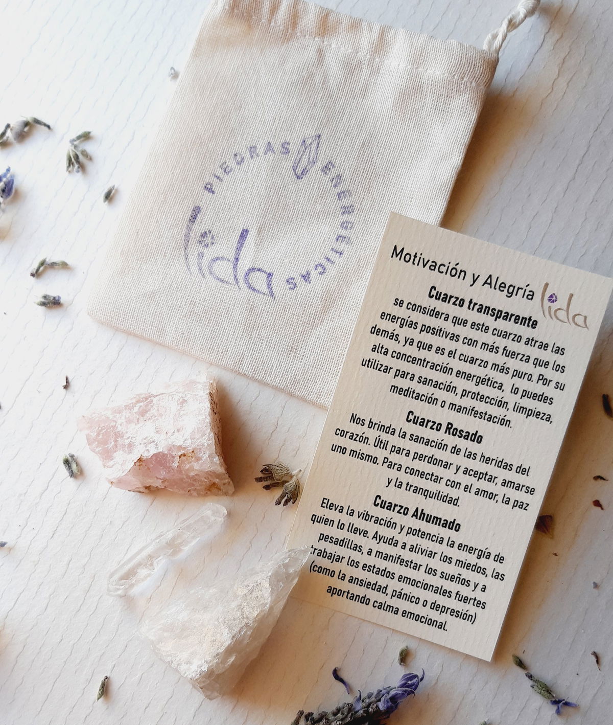 Contiene 3 piedras en bruto de cuarzo rosado, cuarzo agumado y una punta de cuarzo cristal, vienen en su bolsa de tela con las propiedades de las piedras.