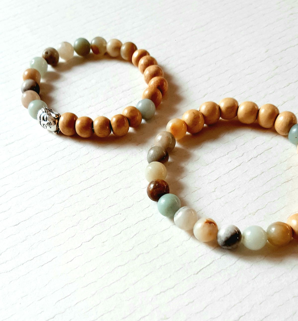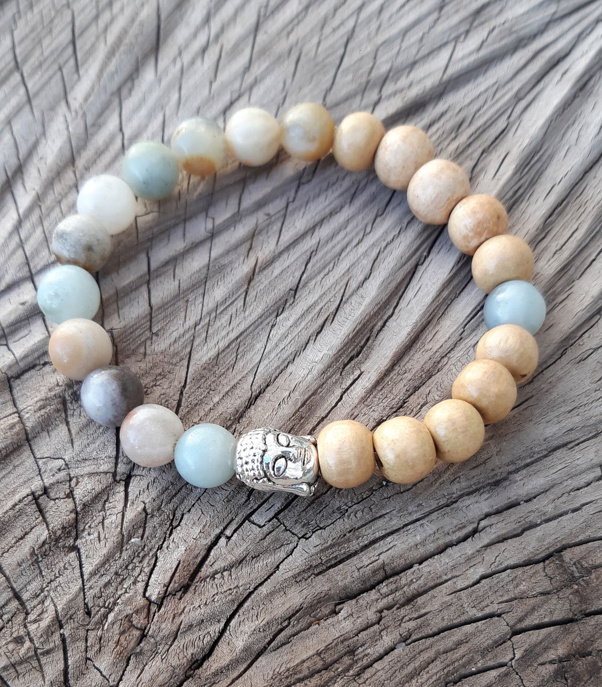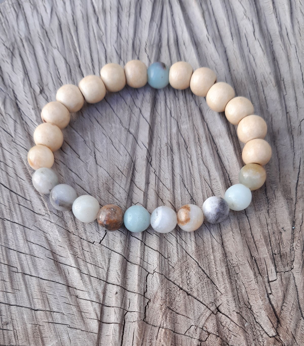 Pulsera elaborada con piedras naturales de amazonita y maderas, se puede elegir con o sin dije metálico.