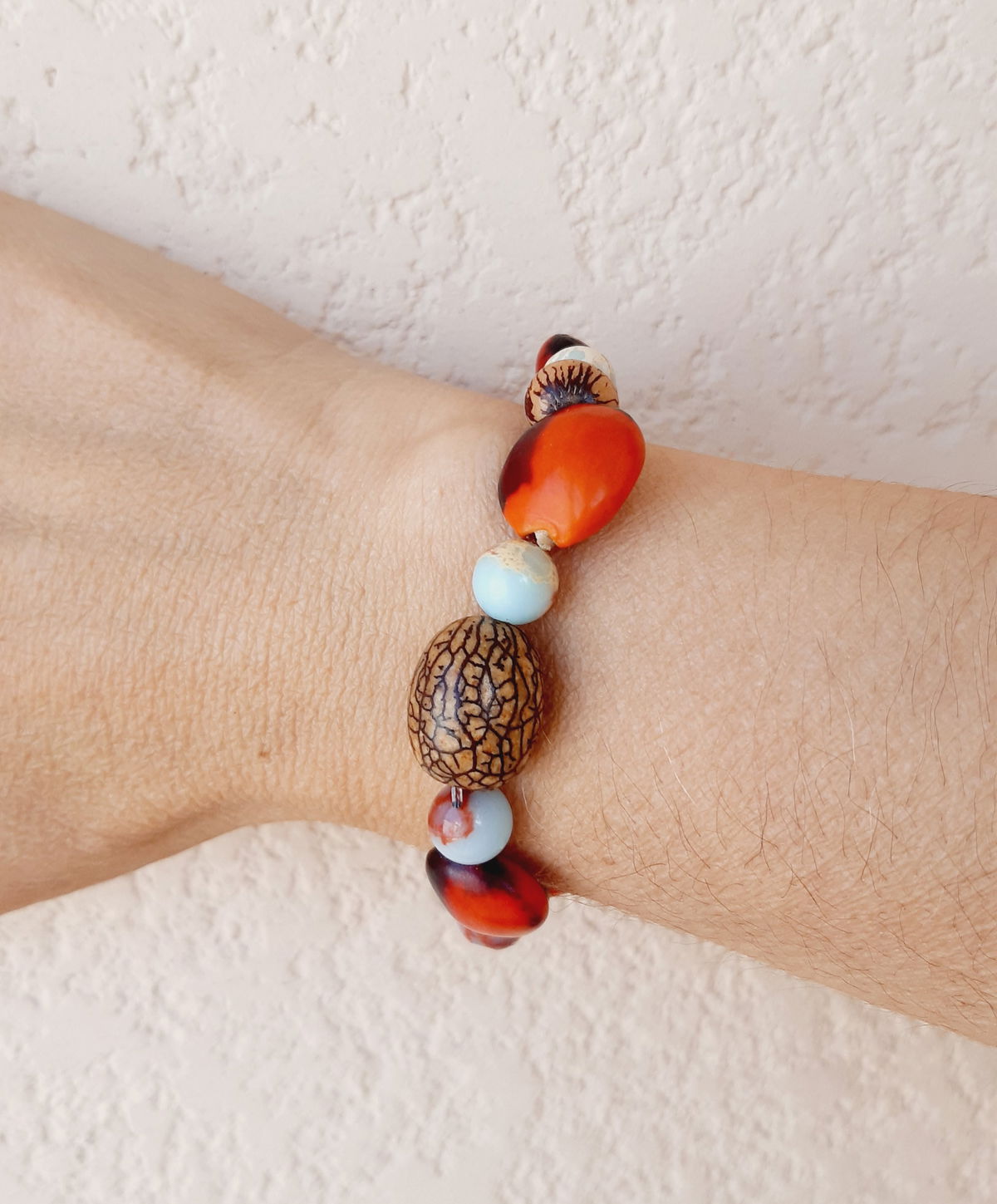Pulsera elástica elaborada con piedras naturales de Jaspe Imperial, semillas de Hauyruro y cerebrito.