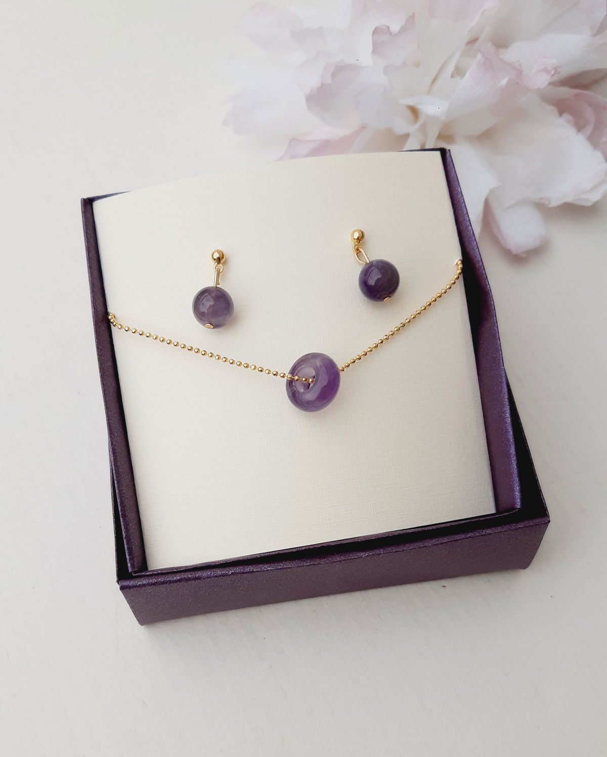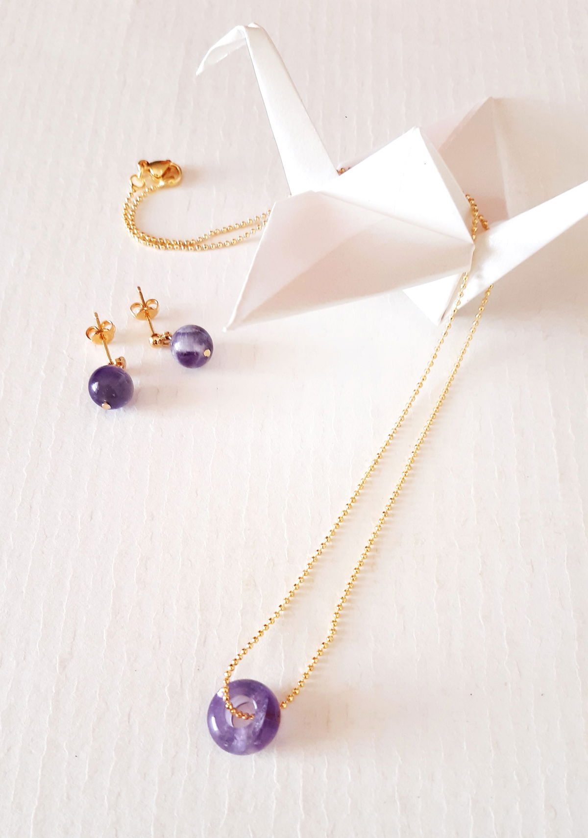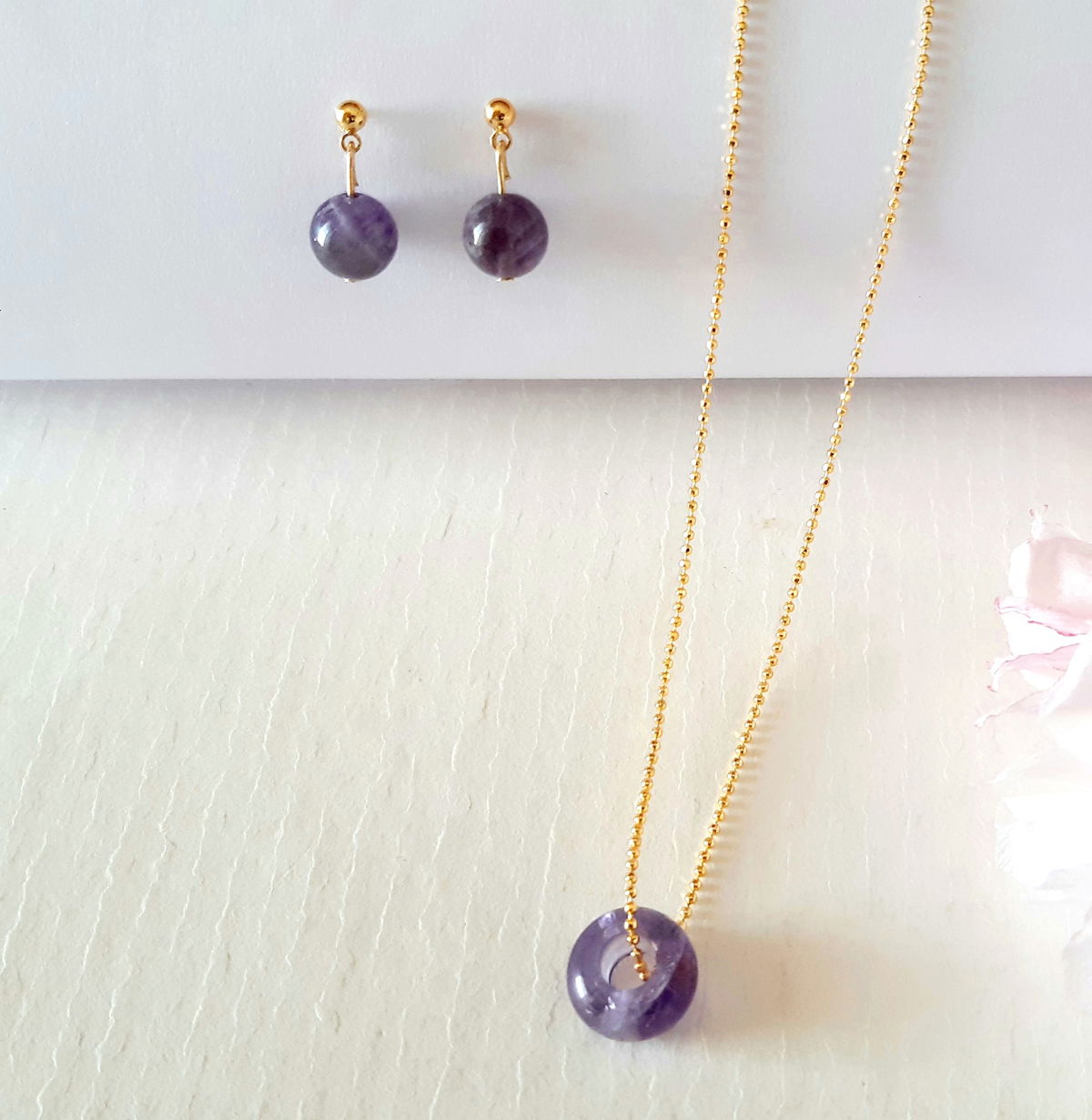 Collar elaborado con Pi o dona de piedra natural de Amatista y cadena de bolitas bañada en oro 18 k. de 45 cm. Aros con piedra de amatista y apliques bañados en oro 18k.
