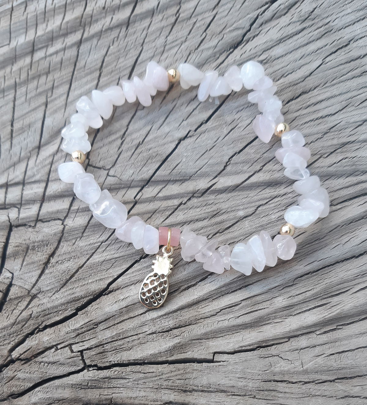 Tobillera elástica elaborada con escalas de cuarzo Rosa natural y apliques bañados en oro 18 quilates.