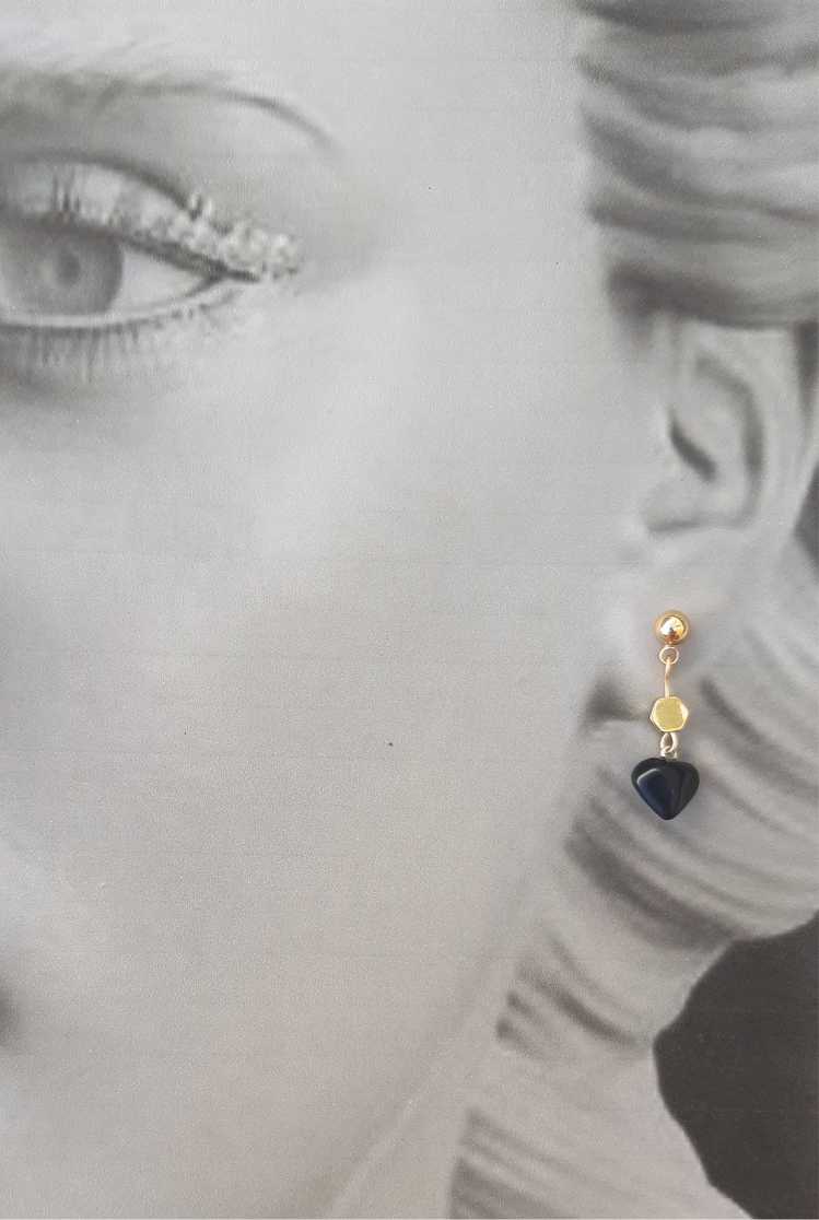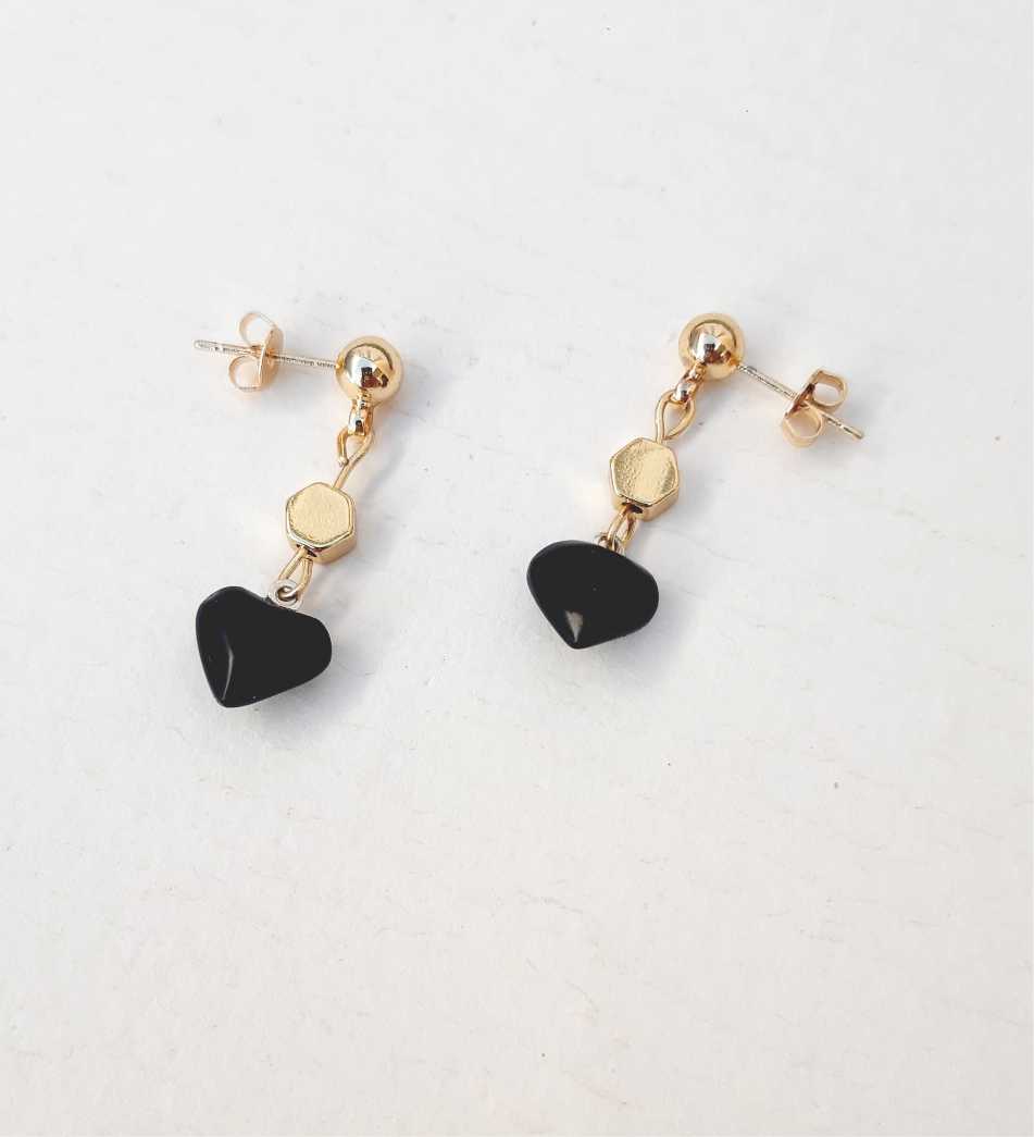 Aros pasantes elaborados con corazones de obsidiana natural, y apliques bañados en oro 18 k.