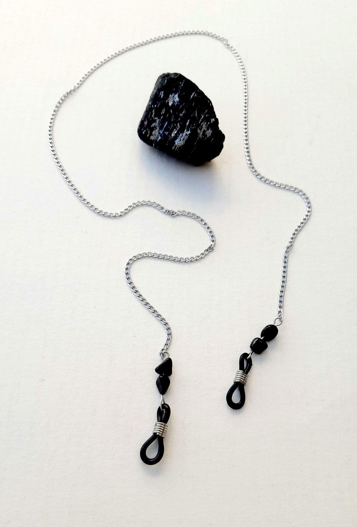 Porta lentes confeccionado con cadena de acero, sujetador de goma negra y piedras de turmalina negra.. 55cm de largo.